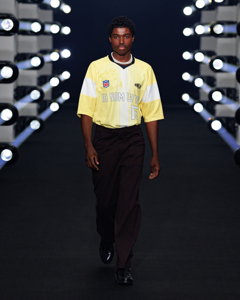 Front: Soft yellow tech jersey featuring a tonal floral artwork subtly integrated across the front. IH NOM UH NIT lettering and varsity number “15” enhance the luxury–sport identity, while contrast white sleeve panels add structure and depth.