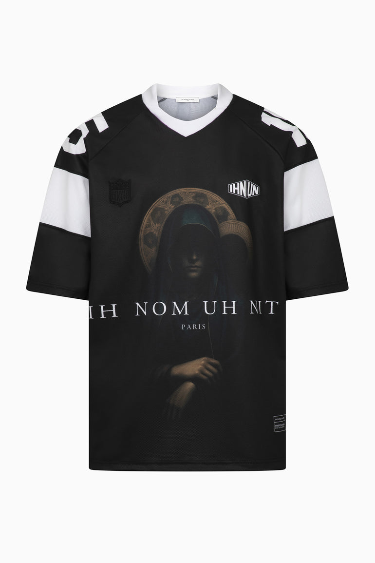 Front: Iconic Holy Mary artwork reinterpreted on a black technical jersey, enriched with IH NOM UH NIT patches and contrast white shoulder stripes for a strong sports–luxury identity.