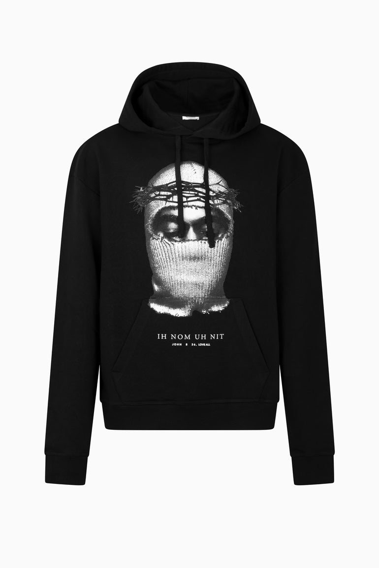 Front: Striking front print featuring a masked face with a crown of thorns and the inscription “IH NOM UH NIT – JOHN 8 36 LOVE ALL.”