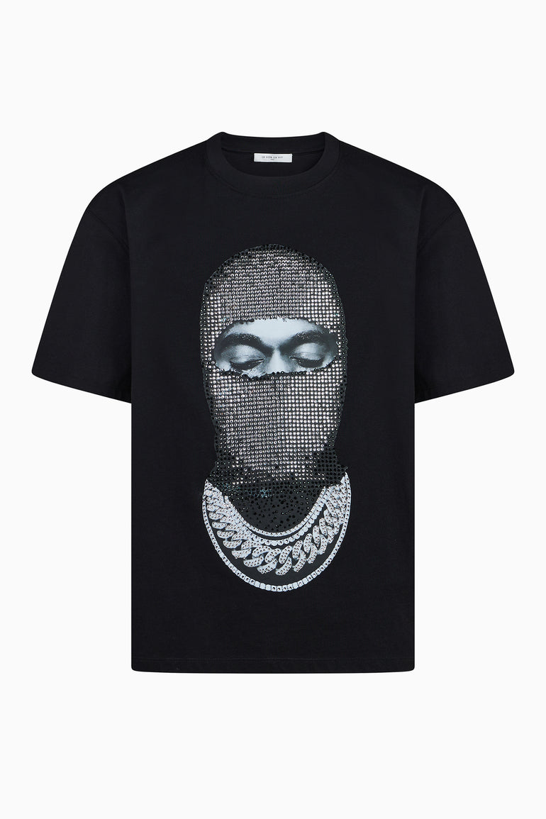 • Front: Black cotton jersey T-shirt with the signature Diamond Mask graphic, elevated by shimmering hotfix rhinestone applications.