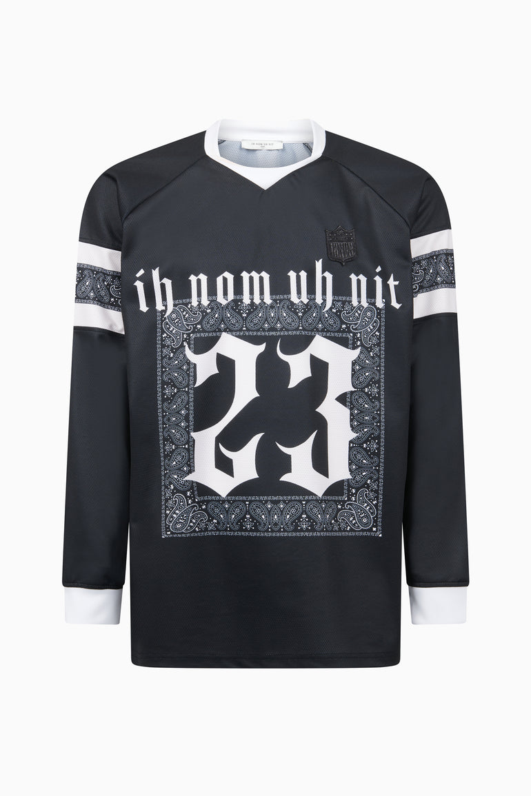 • Front: Oversized “23” graphic framed with paisley bandana print, gothic “IH NOM UH NIT” lettering across the chest, and tonal crest patch at shoulder.