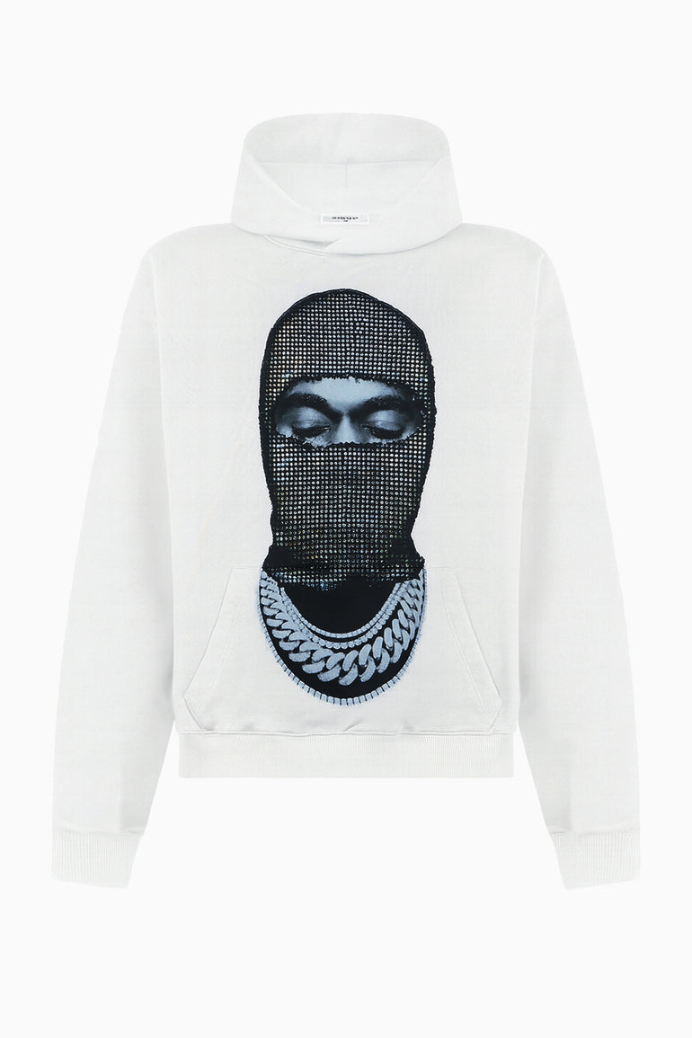 • Front: Black hoodie featuring a bold diamond-studded mask print with chain detail on the chest.