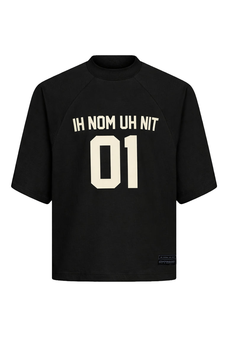 Front: Raglan short-sleeve T-shirt featuring IH NOM UH NIT lettering and bold “01” print at the chest, inspired by classic athletic jerseys.