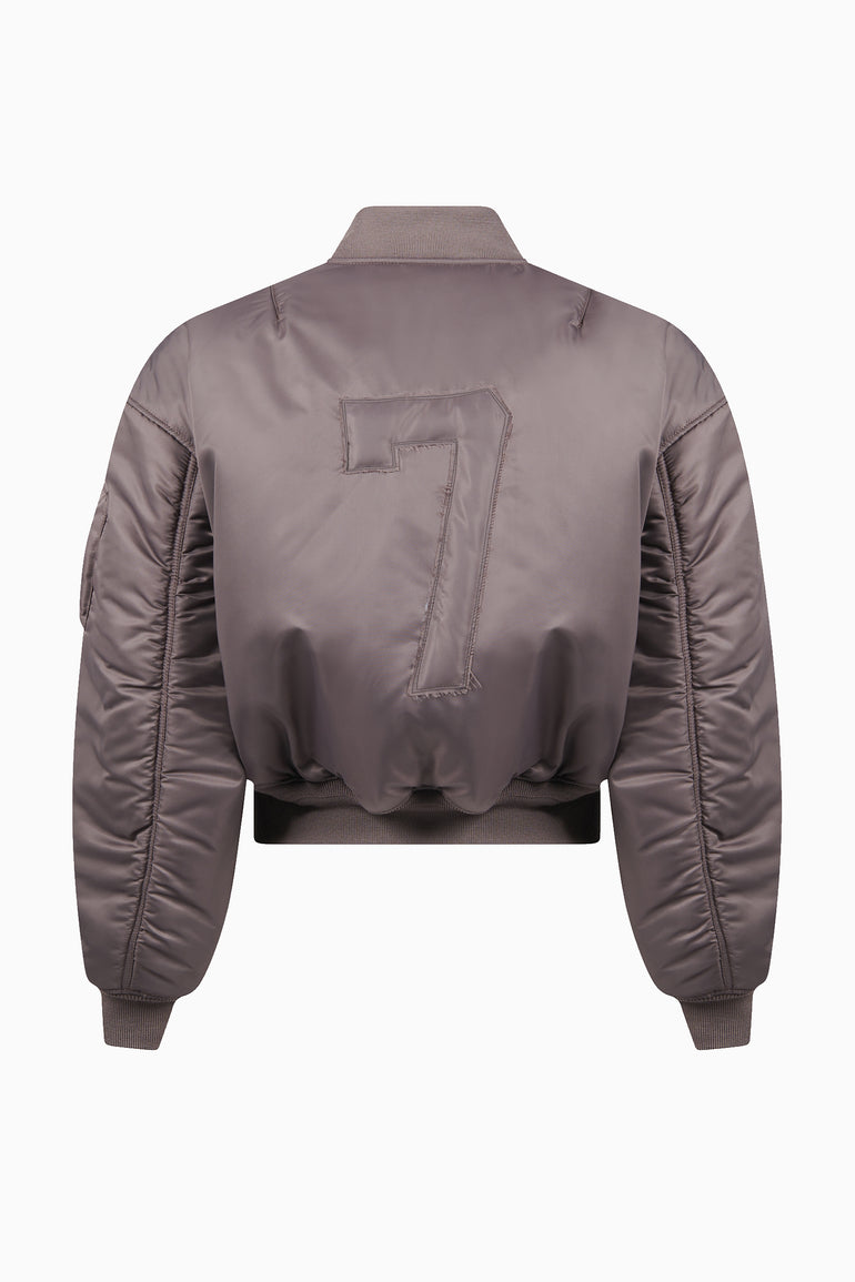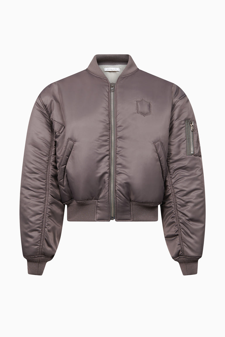 Front: Minimal bomber jacket with tonal stitched logo patch on the chest and front zip closure.