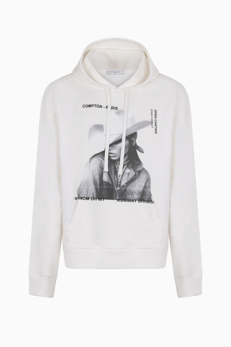 Front: Monochrome cowgirl portrait print with IH NOM UH NIT logo and casting-inspired text details