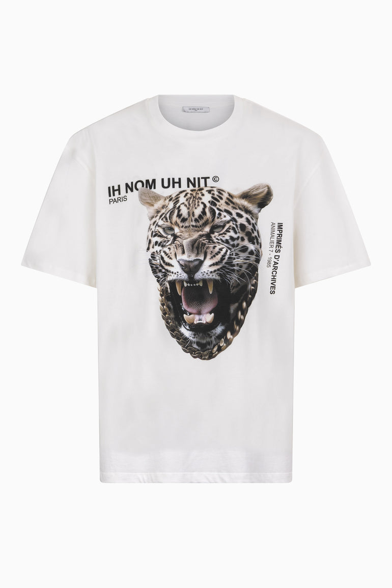 Front: Black cotton T-shirt featuring a roaring leopard print and IH NOM UH NIT Paris logo on the chest.