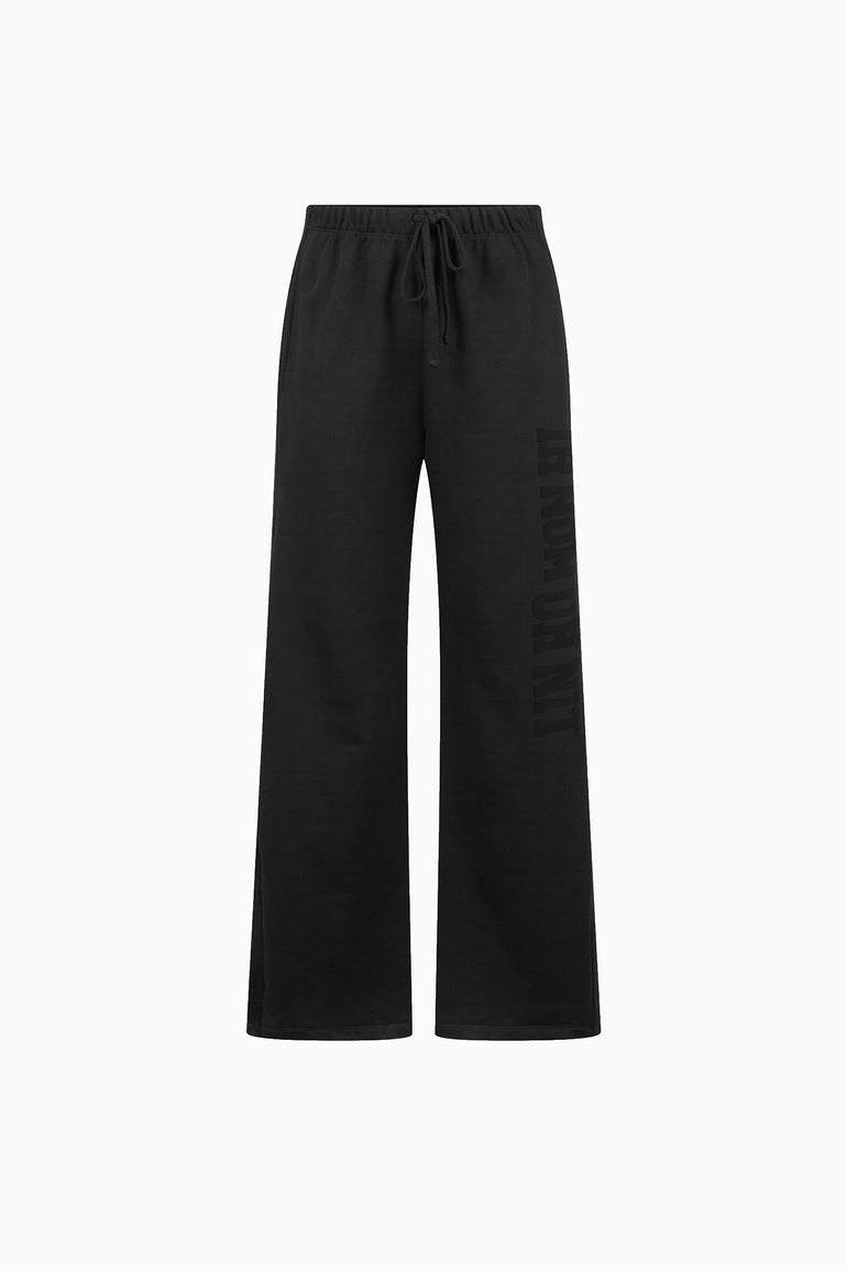 Front: Wide-leg sweatpants in black cotton fleece with adjustable drawstring waist and vertical "IH NOM UH NIT" logo print on the leg