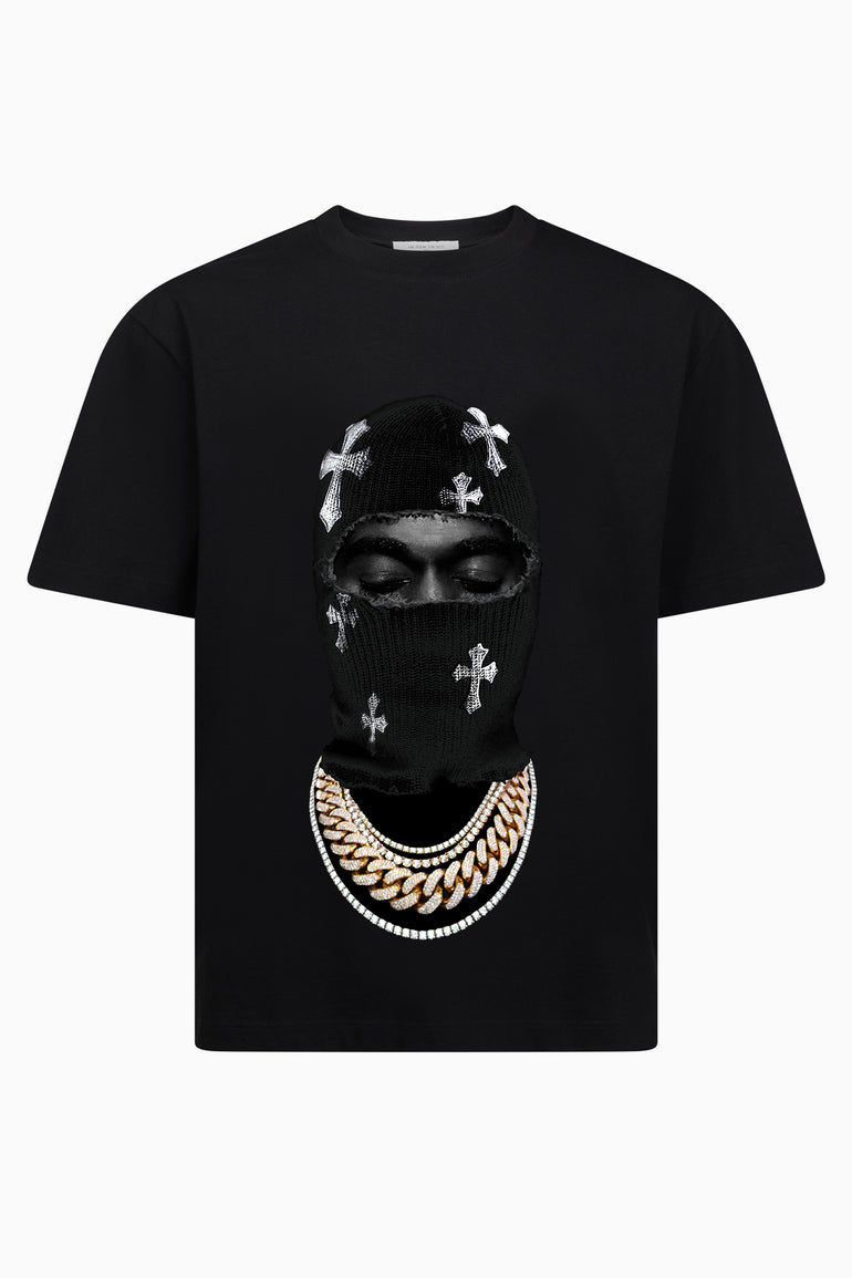 Front: Iconic Mask portrait featuring a black balaclava embellished with all-over cross motifs, paired with a bold chain necklace. A powerful graphic merging street iconography and spiritual symbolism.