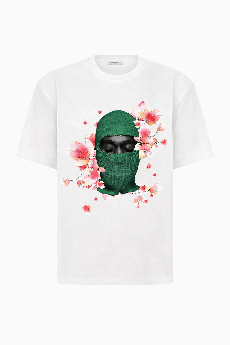Front: Central graphic print featuring the iconic IH NOM UH NIT mask surrounded by delicate floral elements, creating a bold contrast between strength and fragility.